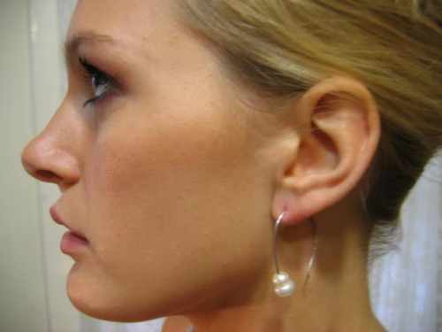 Pearl Hoop Earring. Contemporary Hoop Earring with Double White Domed Freshwater Pearls. For the Bride who likes simplicity with a hint of “the temptress” – 40mm.