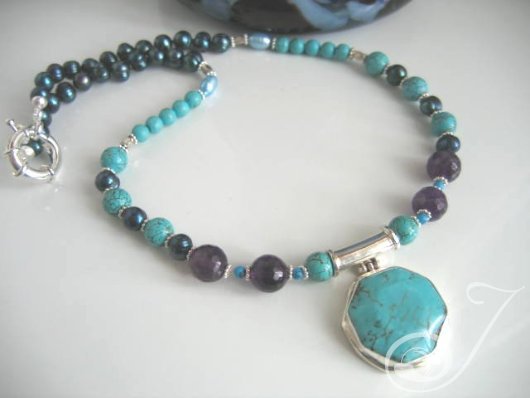 Aquarius Necklace. Bright Turquoise Sterling Silver Pendant Necklace in Turquoise and Pearl