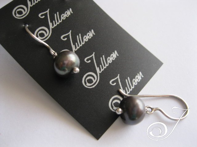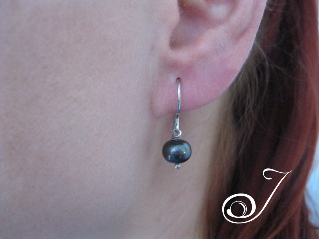 Simple Black Pearl and Sterling Silver Earring. Cushion 8 mm Black Pearl on substantial Sterling Silver Hook. Sometimes simple is best. Total Drop 25 mm