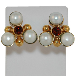 White Pearl and Red Garnet Earring on Post. Cup Style Pyramid Shape White 7mm Button Pearls 5mm Cherry Red Facetted Garnet. 24k Vermeil with Post – 20mm.